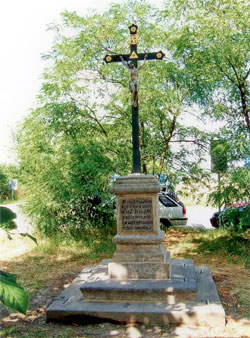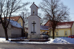Pseudogotická zvonice s Božími muky na návsi v Sibřině