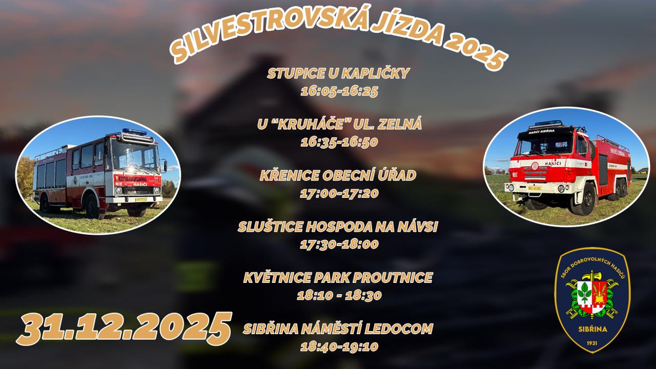 Srdečně vás zveme na naši Silvestrovskou jízdu, která se uskuteční 31. prosince 2025 od 16:00 hod. Společně se rozloučíme s rokem 2025 a oslavíme příchod nového roku v jedinečné atmosféře. Během jízdy projedeme celý náš hasební okrsek a postupně navštívíme několik míst, kde se zastavíme s naší technikou a pozdravíme všechny, kteří se přijdou s námi rozloučit s uplynulým rokem. Seznam zastávek naleznete na obecních stránkách, případně sociálních sítích hasičů. K dispozici bude menší občerstvení v podobě svařáku, čaje, griotky a možná bude i sladké malé překvapení.