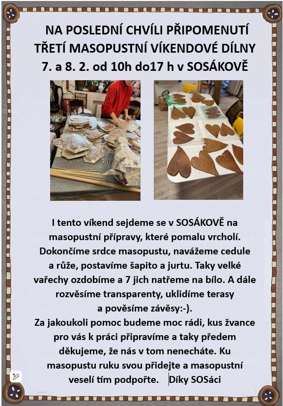 Masopustní víkendové dílny 7. a 8. 2. 2026 v SOSákově